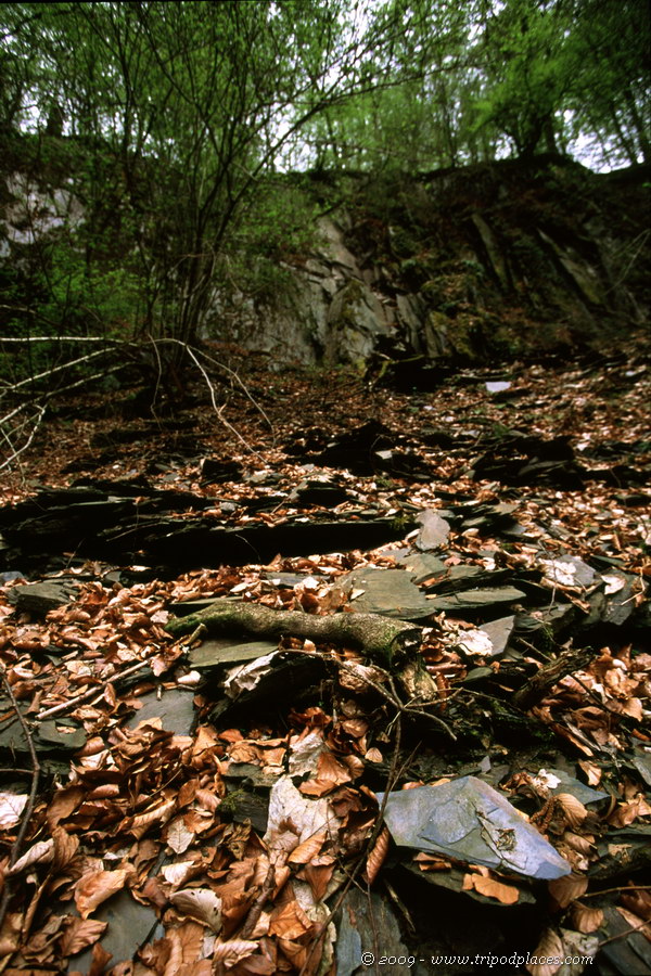 This slate rock wall has been slowly sliding down over the years, with the loose slates mixing in with the old leaves and broken branches near the side of the road. Kautenbach, Germany, spring 2009.